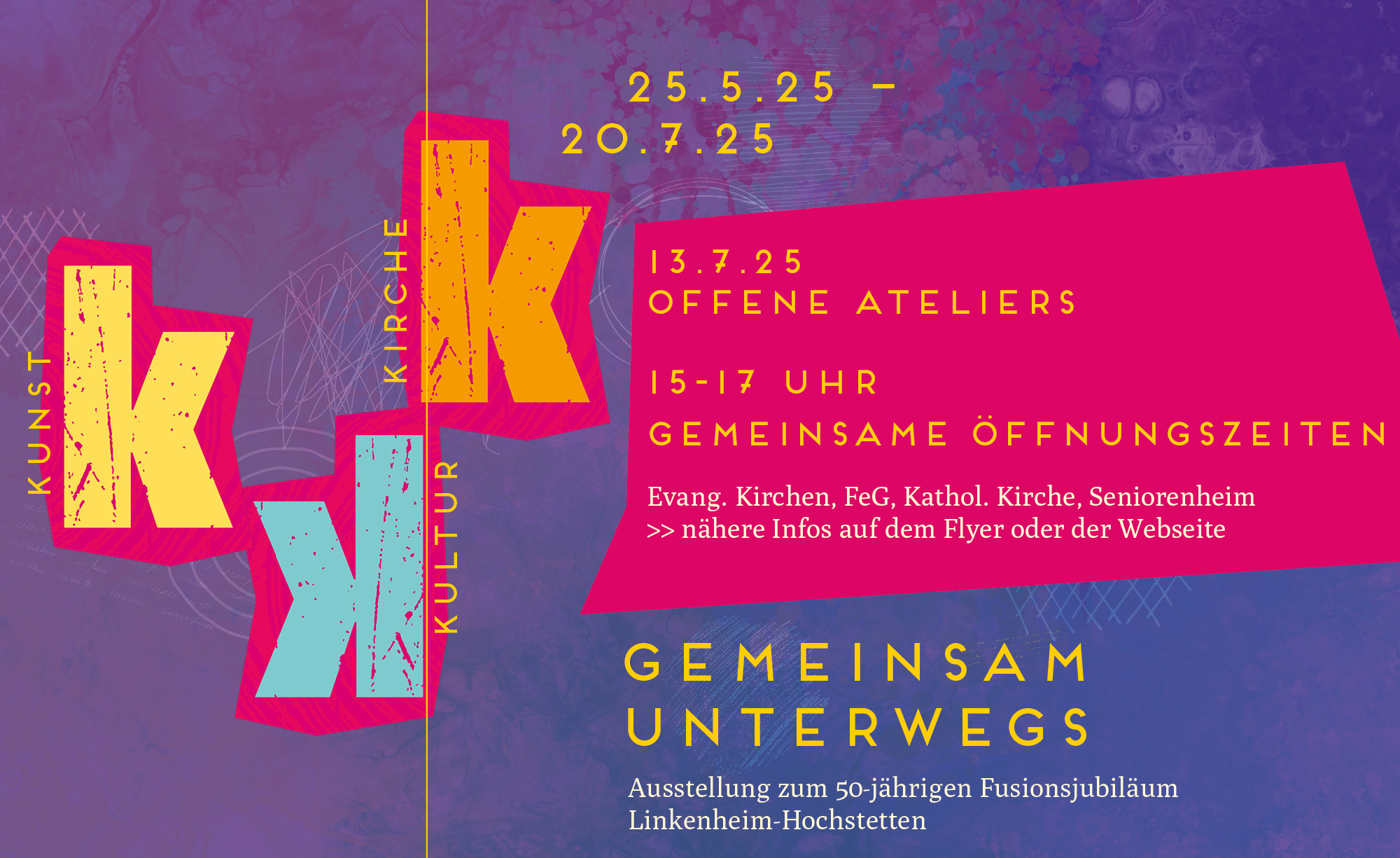 Ausstellung zum 50-jährigen Fusionsjubiläum Linkenheim-Hochstetten 13.7.2025, 15 - 17 Uhr Die Ausstellungen in den evangelischen Kirchen Linkenheim und Hochstetten, bei der FeG Hochstetten, in der katholischen Kirche Maria Königin und im Seniorenheim sind gleichzeitig geöffnet.