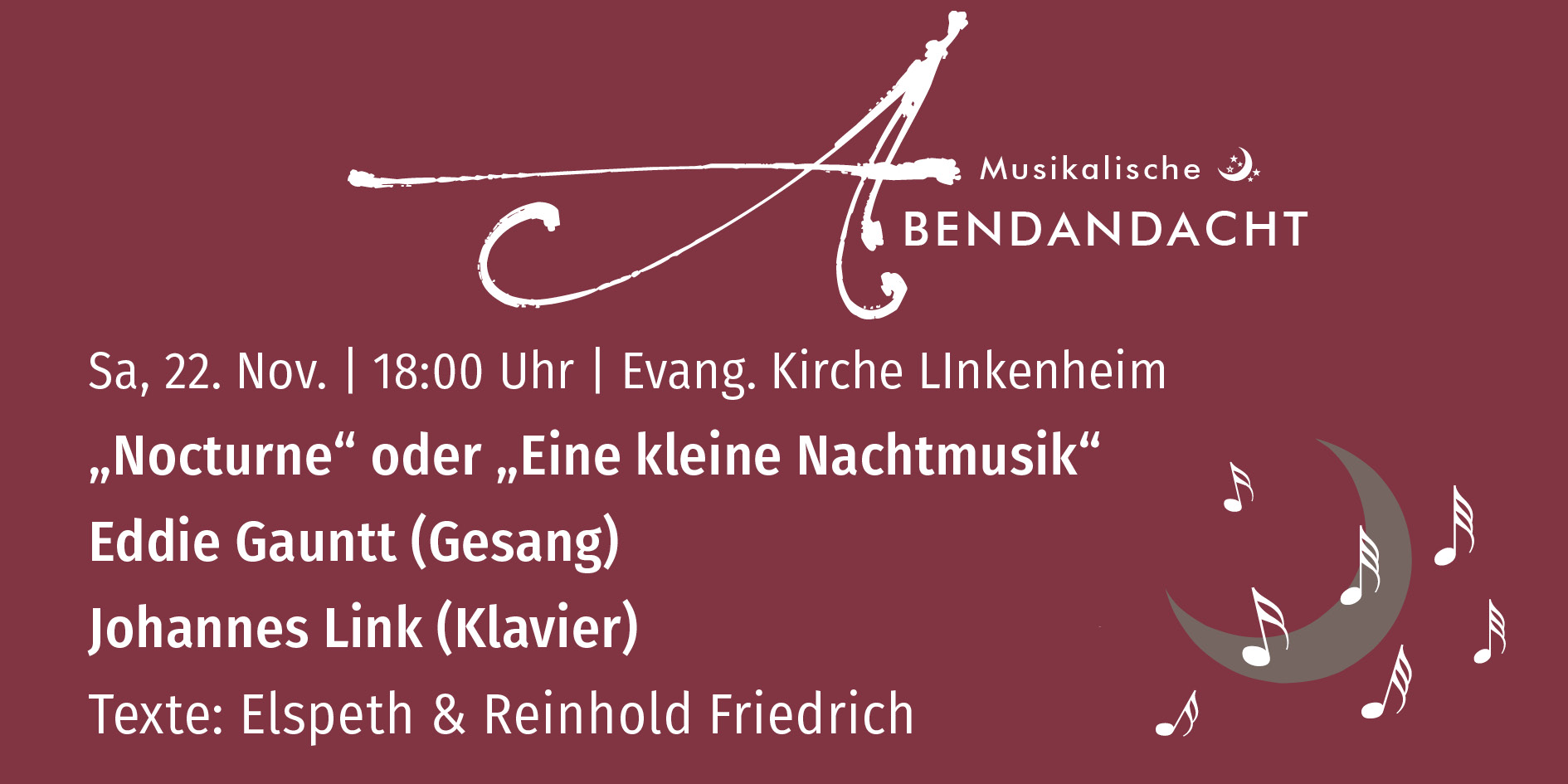 18.00 Uhr | Evang. Kirche Linkenheim "Nocturne" oder "Eine kleine Nachtmusik" Eddie Gauntt (Gesang), Johannes Link (Klavier) Texte: Elspeth und Reinhold Friedrich Eine Gesamtübersicht der kirchenmusikalischen Angebote in unserer Gemeinde finden Sie hier: Flyer_Musiktermine_eBook2025