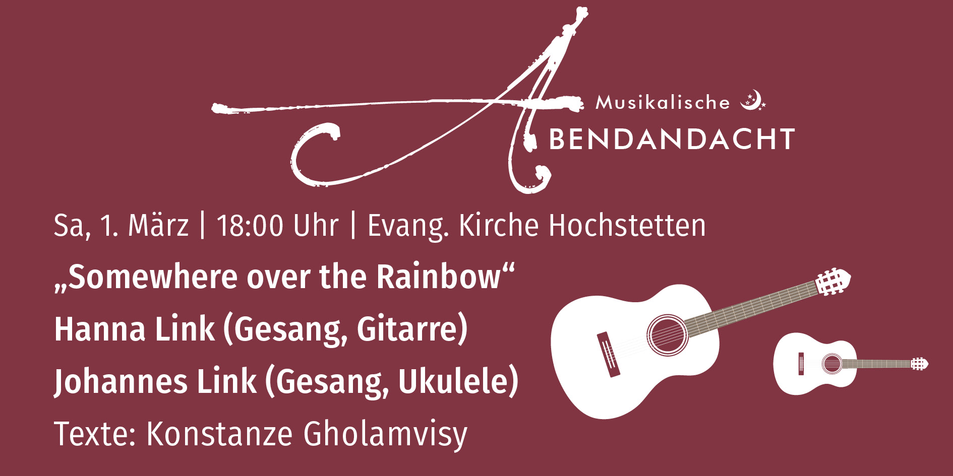 ![]() 18.00 Uhr | Evang. Kirche Hochstetten "Somewhere over the rainbow" Hanna Link (Gesang, Gitarre) Johannes Link (Gesang, Ukulele) Texte: Konstanze Gholamvisy |