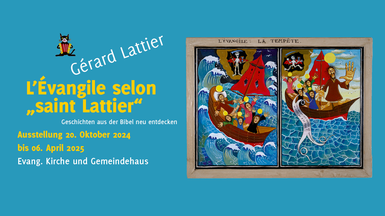 10 Uhr | Evang. Kirche Linkenheim mit Pasteur Jörg Meuth und Kirchenrat i. R. Hans-Martin Steffe Anschließend Finissage im Gemeindehaus zur Ausstellung L'Évangile selon "saint Lattier" von Gérard Lattier.